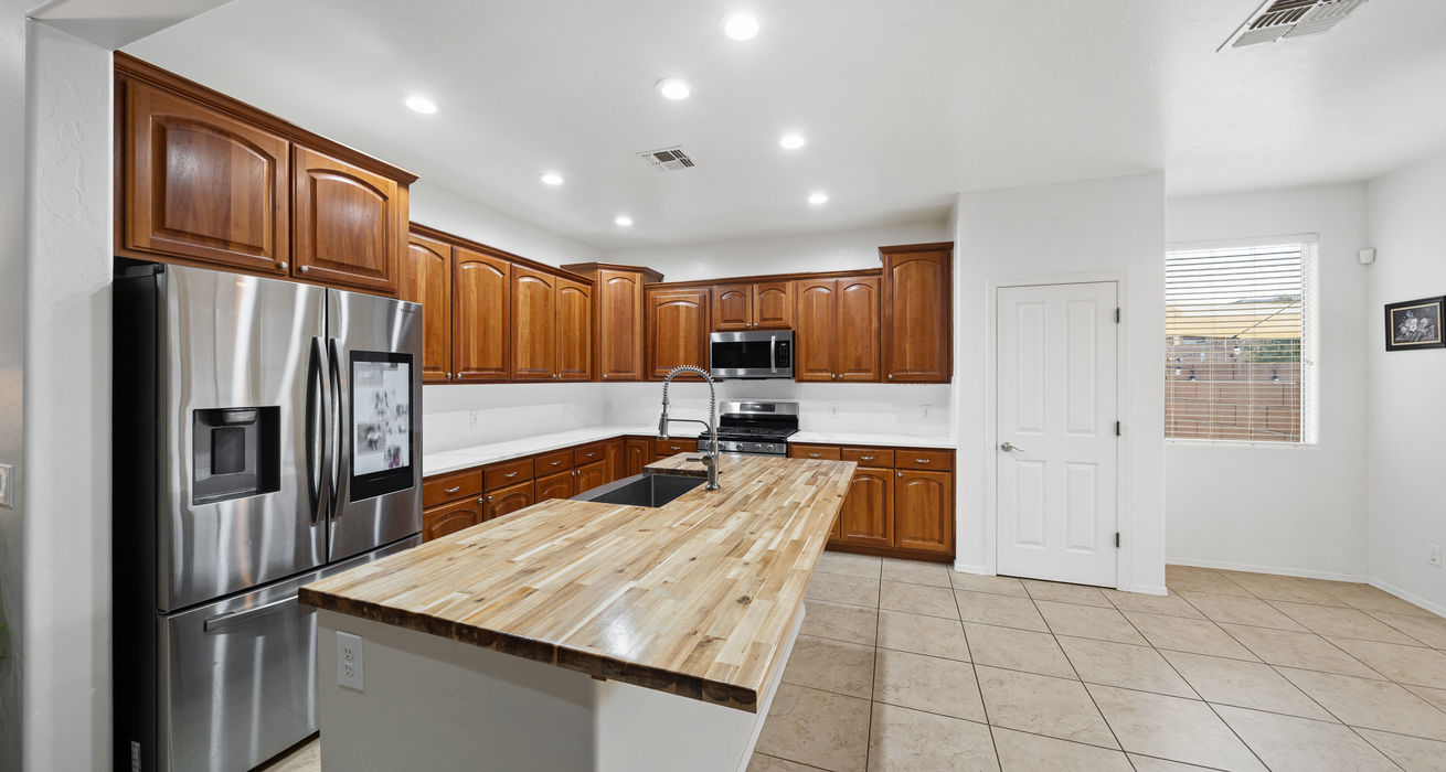 This full-scale kitchen update transformed a dated space into a bright, modern, highly functional workspace. B&G’s Custom Woodworks refreshed all cabinetry with new, painted Shaker-style doors and replaced several lower cabinets with smooth-gliding drawers for improved storage access. A brand-new island—topped with luxurious Taj Mahal quartzite—adds generous workspace, with a built-in trash system and added smart storage near the dishwasher. An unused nook beside the pantry was also reimagined into a custom baking center complete with an appliance lift and dedicated counter space. The result is a beautifully crafted kitchen that blends style, organization, and everyday convenience. Every detail was designed for beauty, efficiency, and the way this family truly uses their kitchen.